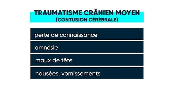 Le Traumatisme crânien moyen ou contusion cérébrale, présente une perte de connaissance initiale accompagnée d'une amnésie du traumatisme. Il entraîne un œdème cérébral au niveau de la plaie ou de l'autre côté (le contre coup).