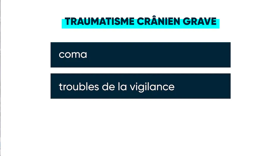 Le Traumatisme crânien grave, est caractérisé par un coma profond d'emblée ou un trouble de la vigilance qui se prolonge.