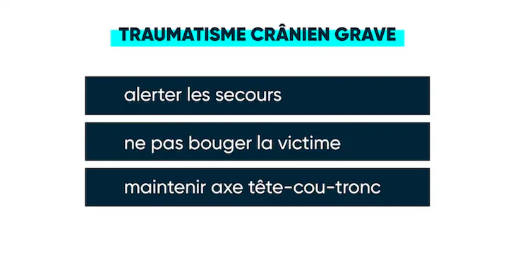 Deuxièmement : Eviter le sur-accident et donc ne pas mobiliser le patient. En effet, dans un traumatisme crânien grave avec une lésion rachidienne associée, il ne faut pas faire relever le patient, il faut maintenir dans l'axe la tête, le cou et le tronc car il y a un risque de lésion cervicale importante.