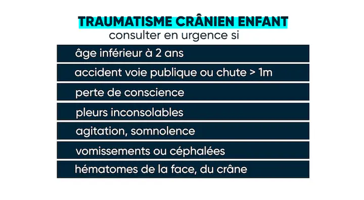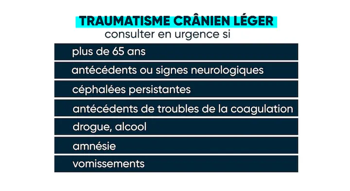 En cas de traumatisme crânien léger, c’est-à-dire traumatisme crânien pour lequel la perte de connaissance est immédiate et de courte durée, il existe des critères qui doivent motiver la consultation médicale en urgence :