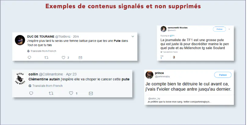 Clara Gonzales, pour sa part, confie que le harcèlement dont elle a elle-même fait l'objet "est allé jusqu'à des appels. Il y avait des menaces de meurtre, de viol, de torture… Quand j'ai vu la toile s'emballer, j'ai angoissé. Et je me suis autocensurée. J'ai arrêté de mentionner le forum, et j'ai posté un message sur Twitter pour dire « d'accord, vous avez gagné »". Pour la militante, qui a participé au rapport du HCE, "faire des études comme celle-ci, c'est une première étape dans la compréhension du phénomène, pour le saisir au niveau social".