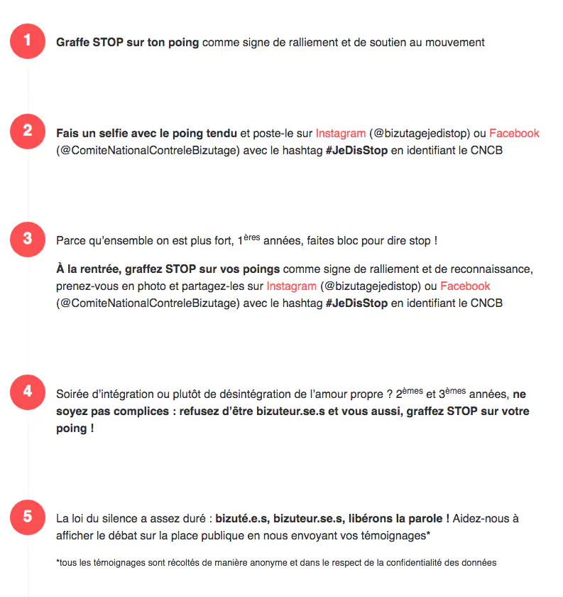 Le but : sensibiliser à une pratique dévastatrice encore largement répandue dans les universités françaises. "Chaque année, ces pratiques perdurent et se diversifient sous couvert de tradition" explique le CNCB. L’instance encourage donc les potentiels bizuteurs – deuxièmes et troisièmes années en particulier – à ne pas céder à la tentation de reproduire ces schémas.