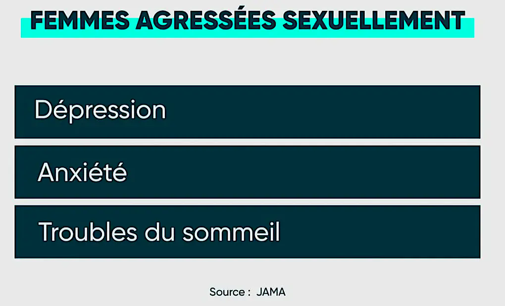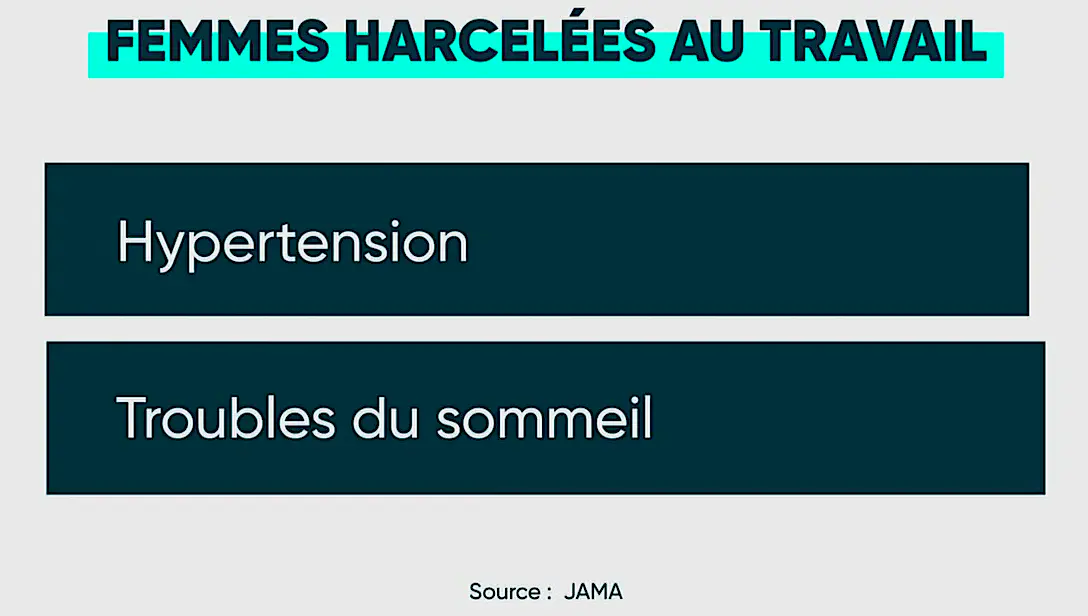 Les résultats montrent que les femmes ayant déjà été harcelées sexuellement au travail présentent plus d'hypertension et de troubles du sommeil que les autres. Et les femmes qui ont été victimes d'agression sexuelle présentent davantage de dépression, d'anxiété et de troubles du sommeil que les autres. Même si le panel reste limité, ces résultats confirment que les violences sexuelles ont un impact significatif sur la santé des femmes et qu'il s'agit d'un enjeu de santé publique.
