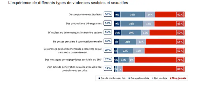 Premier enseignement : le sexisme fait partie de la vie de la majorité des femmes. 58% des répondantes ont déjà été exposées à des comportements déplacés, 57% à des propositions dérangeantes et une sur deux à des insultes ou des remarques à caractère sexiste (50%). Mêmes constats en ce qui concerne les gestes grossiers à connotation sexuelle (45% des femmes y ont déjà été confrontées) et des caresses ou des attouchements à caractère sexuel sans leur consentement (43%). Les faits déclarés ne sont pas "cloisonnés" : les violences peuvent être répétitives et cumulatives.