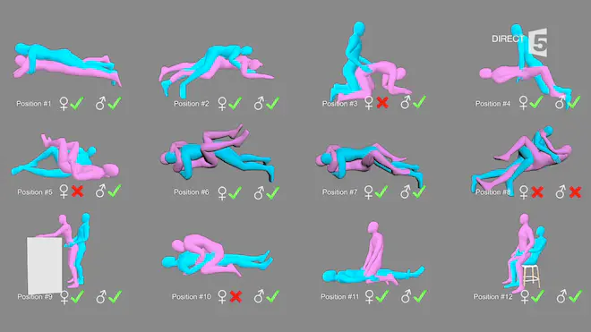 Pour les hommes, la seule position (position 8 voir image ci-dessous) problématique lors du test était celle où les deux partenaires ont chacun une jambe fléchie. Cette position peut induire des collisions dans les structures osseuses.