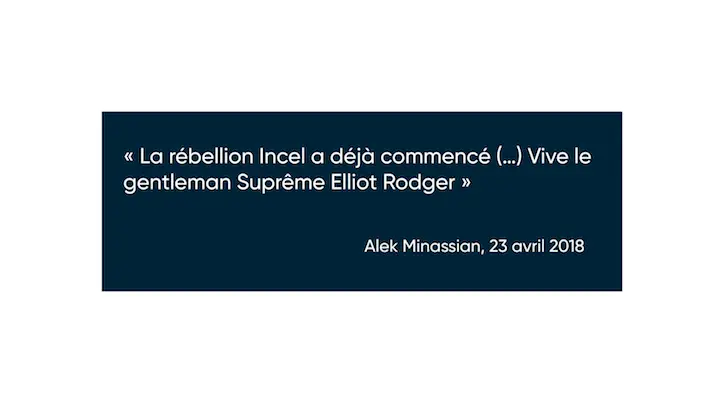 Ce mouvement peut encore aller beaucoup plus loin que des mots sur internet, cette fois-ci hors des écrans. Ils agissent en effet dans la vie réelle. C'est une idéologie qui pousse à la violence physique, jusqu’au meurtre, jusqu’au féminicide, c’est-à-dire tuer des femmes tout simplement parce qu’elles sont des femmes.