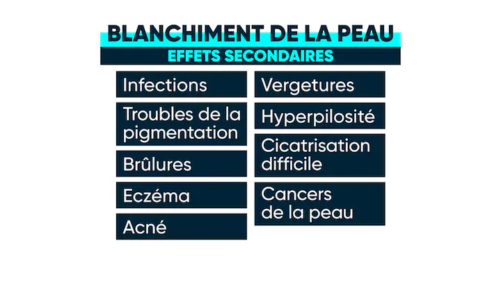 Ces produits blanchissants peuvent provoquer de nombreux problèmes de santé : des infections, des troubles de la pigmentation, des brûlures, de l’eczéma, de l’acné, des vergetures, de l’hyperpilosité, des difficultés à cicatriser car la peau est fragilisée, des cancers de la peau.