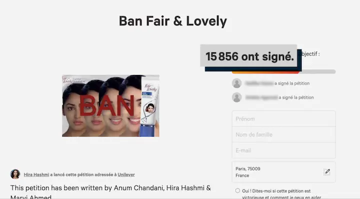 En juin, cette année, la marque a décidé de rebaptiser cette crème, elle s’appelle maintenant "Glow and lovely" qu’on peut traduire par "Rayonnante, lumineuse et jolie". Une pétition en ligne qui a déjà recueilli plus de 15 000 signatures demande à la marque Unilever d’aller plus loin et d’arrêter de commercialiser cette crème.