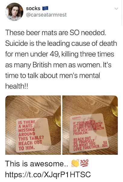 Une récente campagne a eu un grand impact en Grande-Bretagne : des sous-bocks, ces petits cartons qu’on met sous les verres dans les pubs ou les bars, sur lesquels était écrit "Est-ce qu’un de vos potes manque autour de la table ? Appelez-le !", et au dos un message expliquant que le changement de comportement d’un ami peut être lié à un problème de santé mentale, et ces conseils : "Contactez-le / Restez vous-mêmes / Faites quelque chose que vous aimez ensemble".