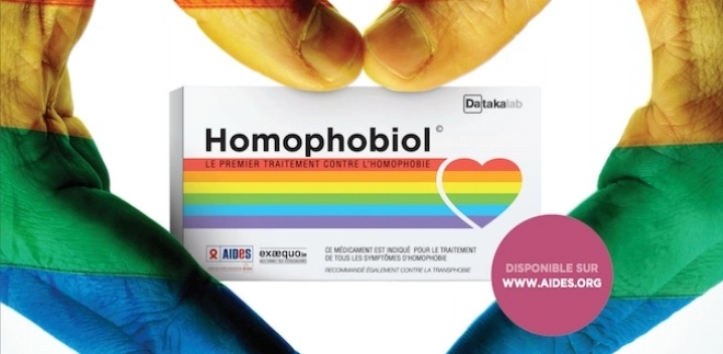 "Parce que traiter l'homophobie, c'est aussi faire reculer le sida", les associations AIDES et Ex Æquo ont lancé un tout nouveau médicament, pour lutter contre l'homophobie et la transphobie : l'Homophobiol©. Avec pour slogan "Homophobiol©, c'est pas pour les tafioles" ou "Homophobie, on n'est jamais trop aidé", la campagne mise sur l'humour pour désarmer les homophobes.