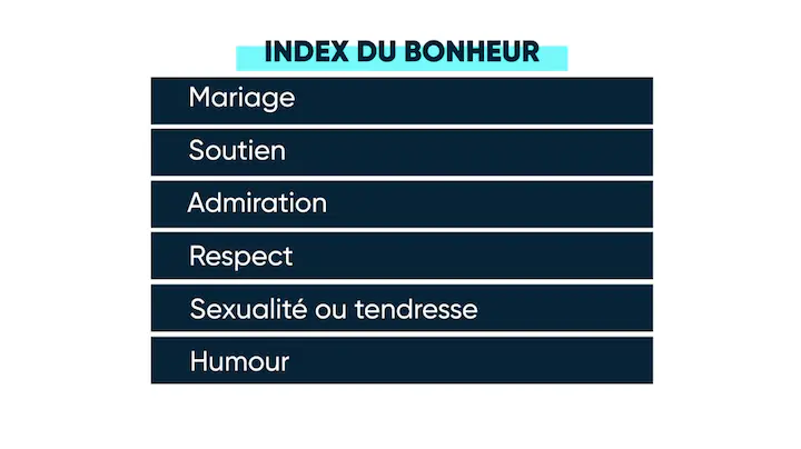 Cet index du bonheur est la conclusion d'une étude menée auprès de 3 000 personnes qui ont répondu à plus de 900 questions. Il révèle les principes simples et essentiels qui font le bonheur d'un couple et quelques caractéristiques recoupent celles du "Laboratoire de l'amour".