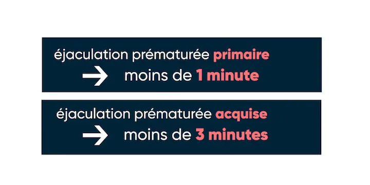 On parle "d’éjaculation prématurée primaire" quand elle a toujours eu lieu. On la distingue de "l’éjaculation prématurée acquise" qui elle, survient après que l’homme ait connu une éjaculation normale. Parfois c’est dû à un problème médical ou une difficulté psychologique. Il existe des données précises sur ces deux problématiques, selon la société de médecine sexuelle, l’éjaculation prématurée primaire survient dans un délai de moins d’une minute chez 80% des hommes concernés alors que l’éjaculation prématurée acquise, survient dans un délai un peu plus long, à moins de trois minutes.