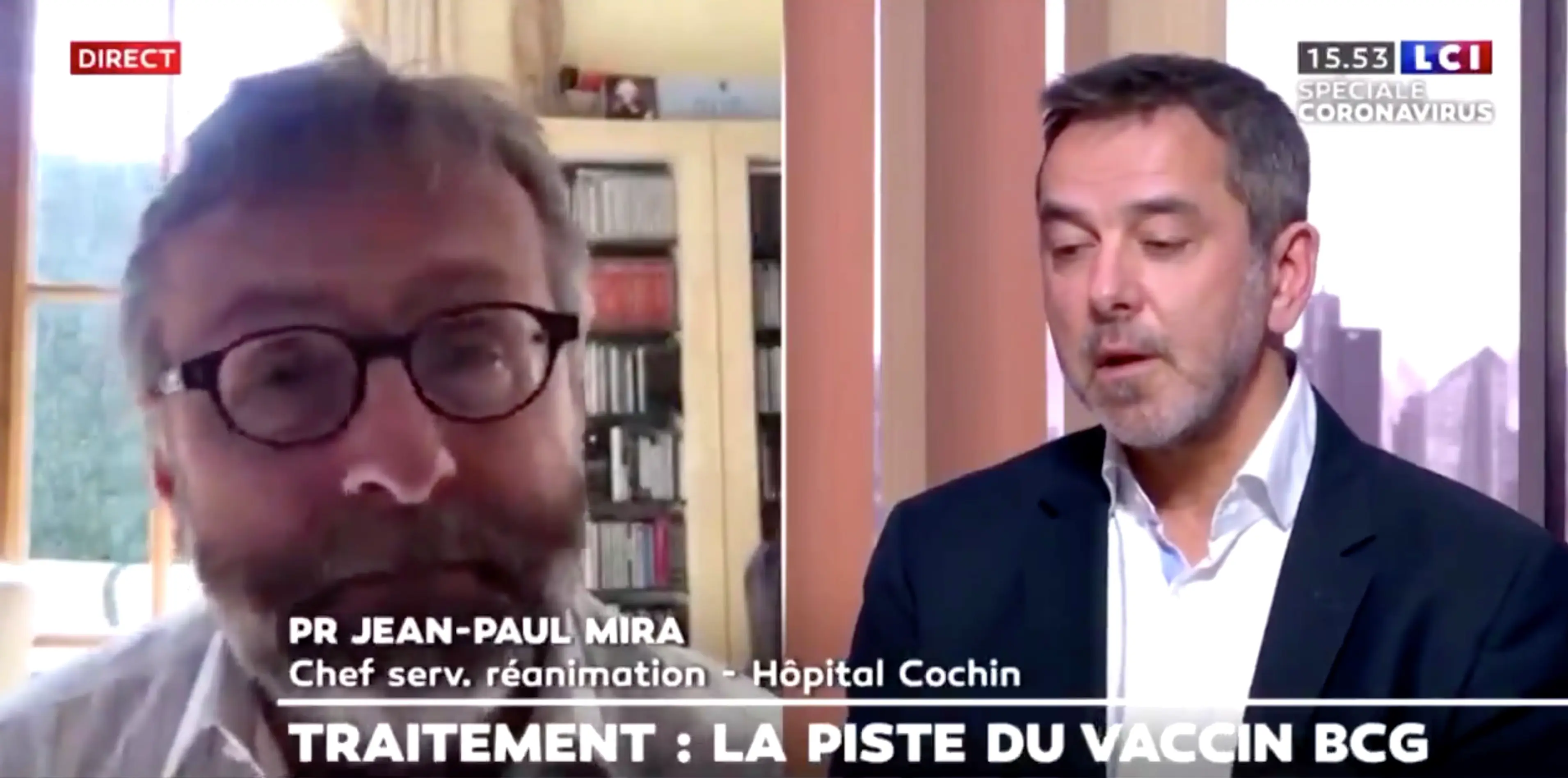 Dans cette séquence diffusée mercredi après-midi, Camille Locht, directeur de recherche à l'Inserm à Lille, est interrogé sur des recherches menées autour du vaccin BCG pour le Covid-19. Invité en plateau, Jean-Paul Mira, chef de service de médecine intensive et réanimation à l'hôpital Cochin, lui demande alors : "Si je peux être provocateur, est-ce qu'on ne devrait pas faire cette étude en Afrique, où il n'y a pas de masques, pas de traitement, pas de réanimation, un peu comme c'est fait d'ailleurs sur certaines études avec le sida, où chez les prostituées : on essaie des choses parce qu'on sait qu'elles sont hautement exposées. Qu'est-ce que vous en pensez?"