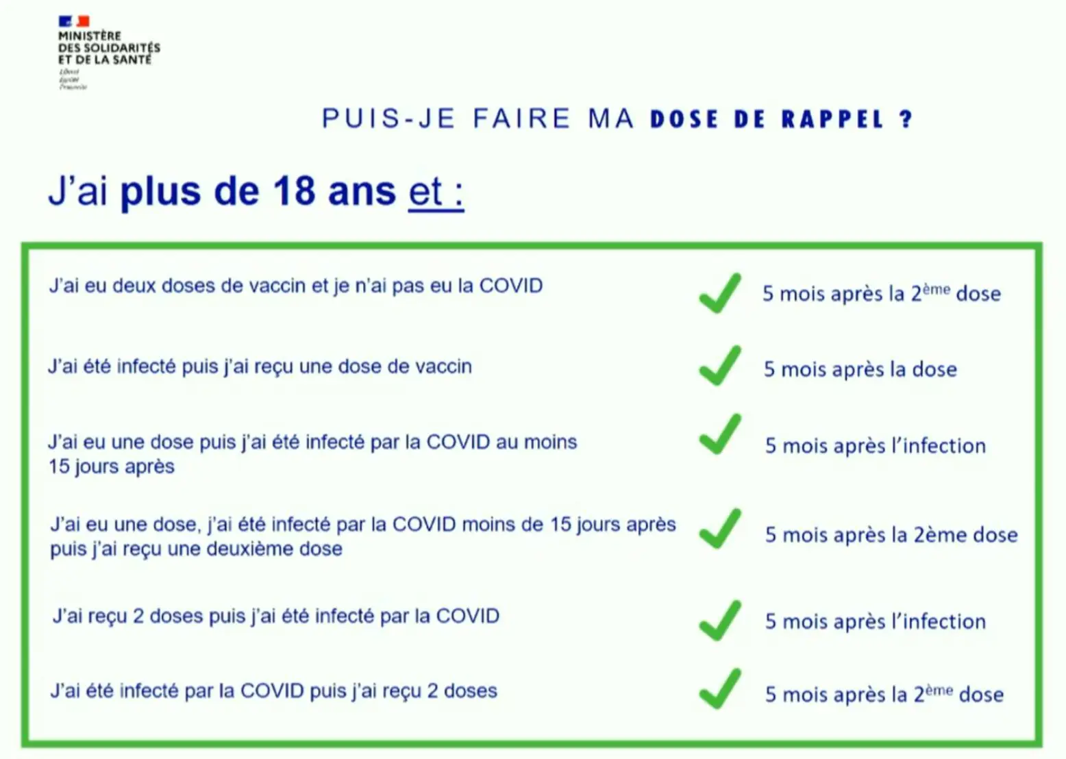 De même, "si vous avez reçu une première injection puis vous avez le Covid, cinq mois après, vous recevez votre rappel". Enfin, "si vous avez eu deux injections et que vous avez eu malgré tout le Covid dans les cinq mois, vous pourrez bénéficier d'un rappel cinq mois après votre test positif."